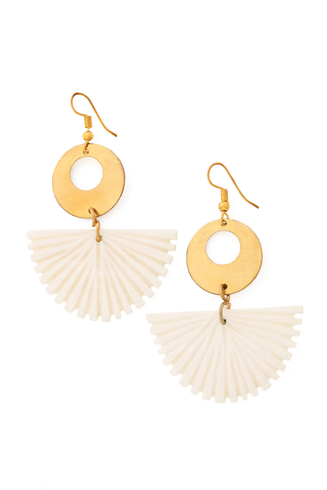 Handcrafted by Kenyan artisans, these earrings feature creamy white cow bone carved into a beautiful fan shape, suspended from a warm brass disc. Lightweight and eye-catching, they blend natural texture with artful detail.