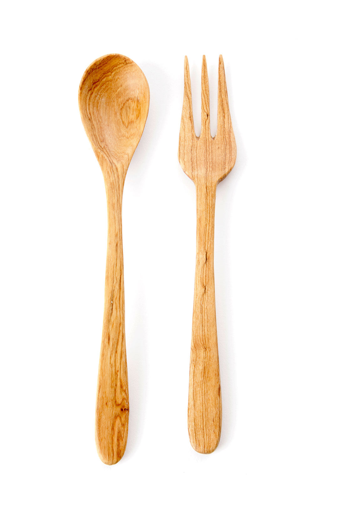 Our wild olive wood fork and spoon set is crafted by Kamba artisans in Kenya from beautifully grained wood. Since each piece is hand carved, every set is completely unique.