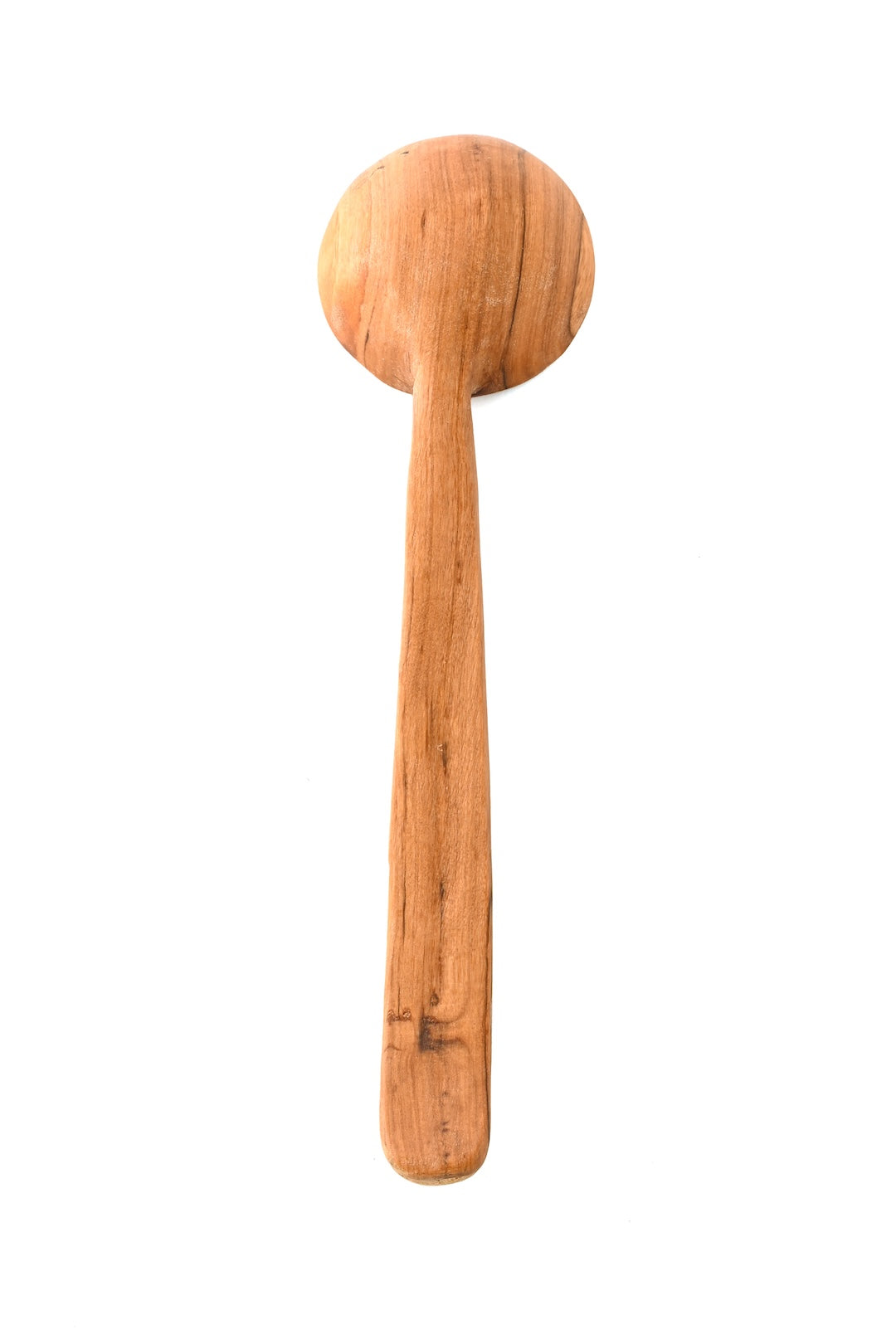 This unique wild olive wood ladle or scoop sports a design etched in cow bone at the end of its long, curved handle. The varied grain of olive wood makes each ladle completely unique.