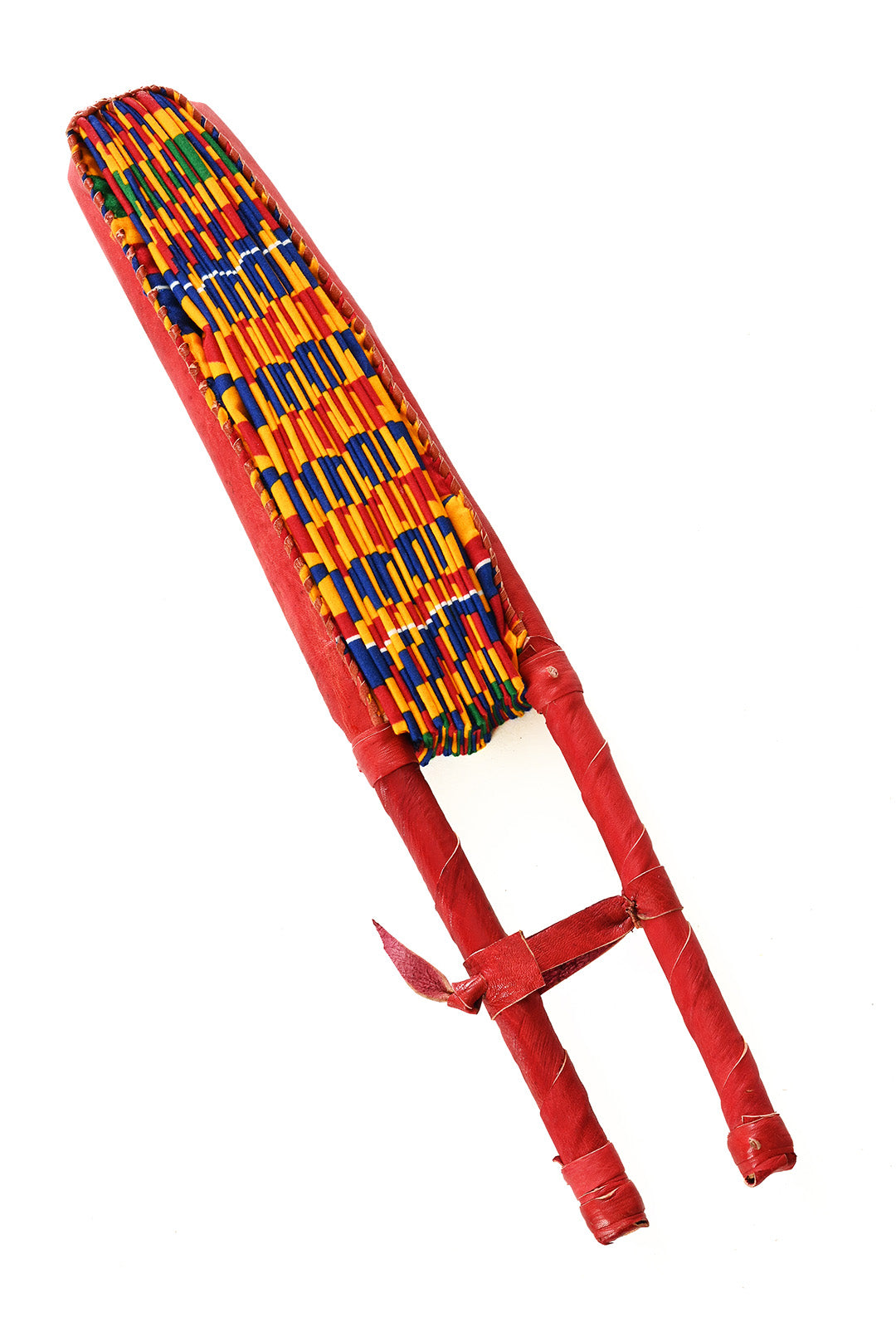 Sold singly in assorted patterns with brown or red leather handles. Because this is a handcrafted item, each will vary.