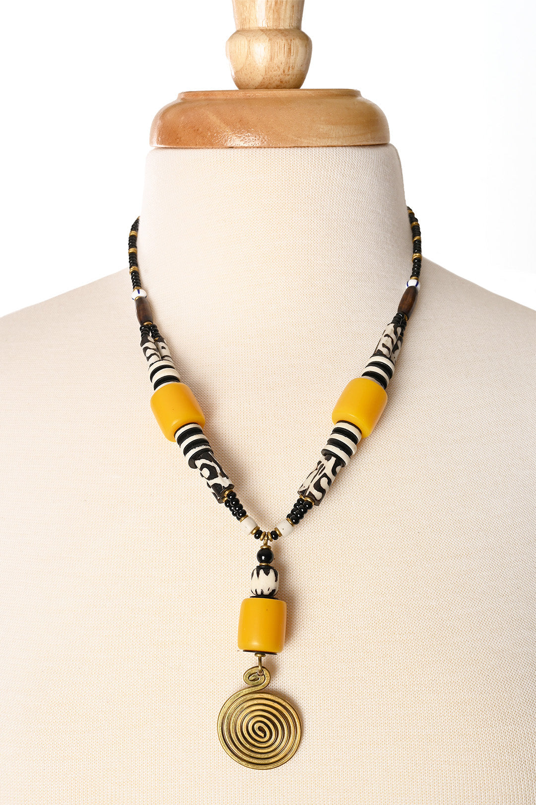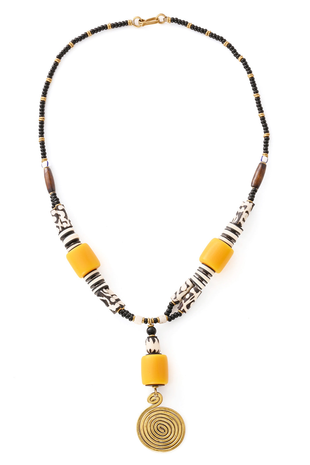 Handcrafted by Kenyan artisans, this cheerful necklace features sunny yellow resin beads hugged by vintage ‘phono’ disk beads made from recycled vinyl records and accented with batiked bone and glass beads. The design is finished with a coiled brass medallion, the perfect touch that combines a retro vibe with modern style.